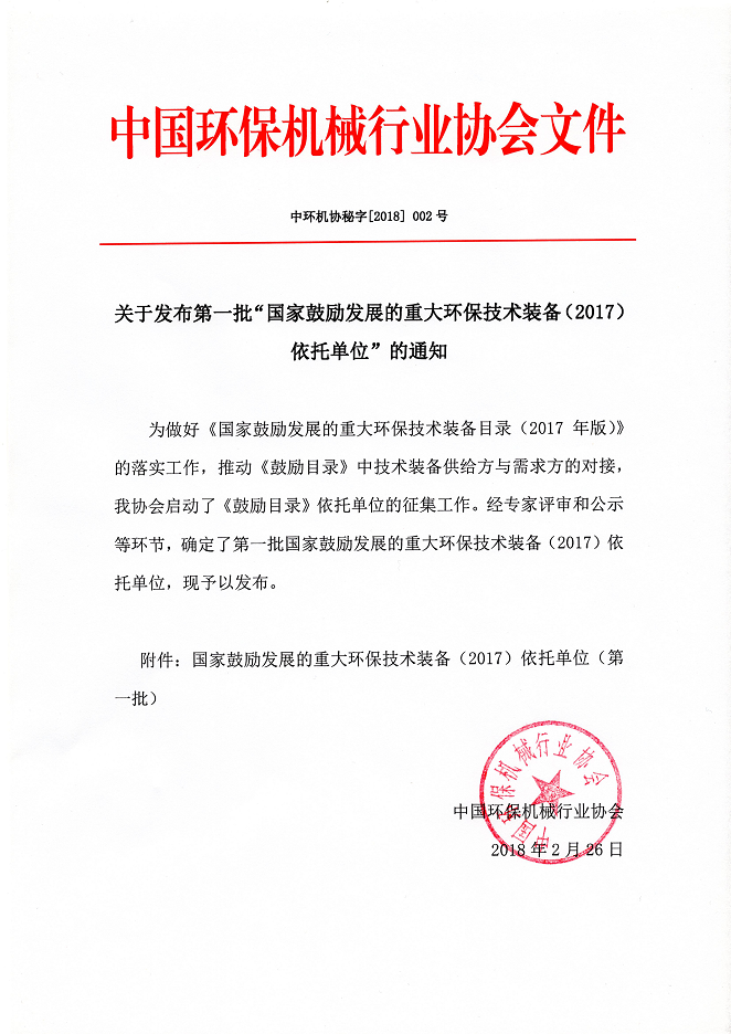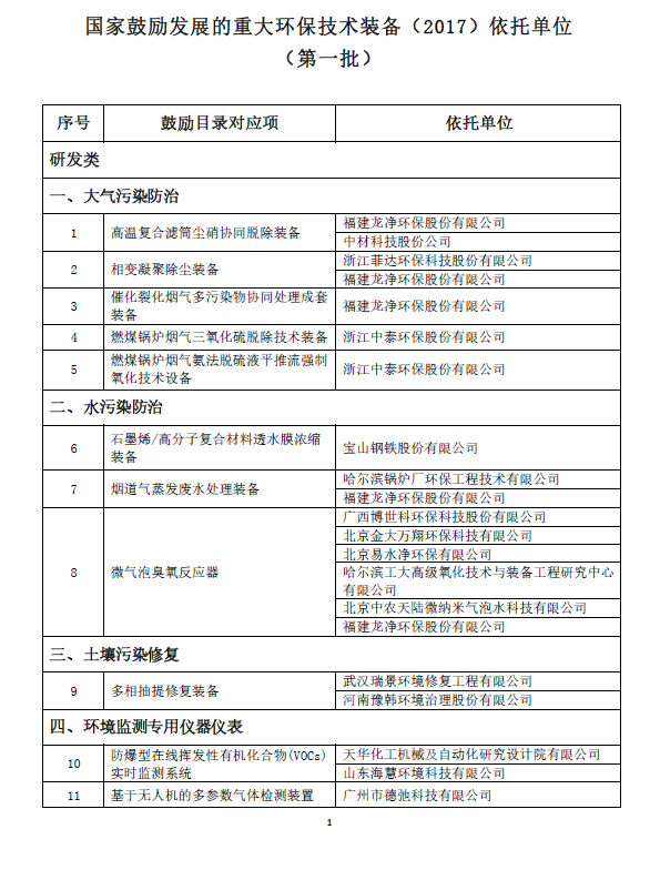 關于發布第一批“國家鼓勵發展的重大環保技術裝備(2017)依托單位”的通知
