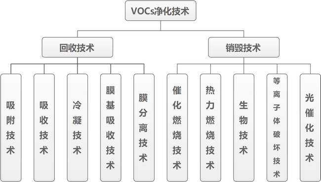 第二類技術為控制性措施,以末端治理為主。末端控制技術包含兩類,即回收技術和銷毀技術(圖 1)。回收技術是通過物理的方法,改變溫度、 壓力或采用選擇性吸附劑和選擇性滲透膜等方法來富集分離有機污染物的方法,主要包括吸附技術、吸收技術、冷凝技術、膜分離技術、膜基吸收技術等。 回收的揮發性有機物可以直接或經過簡單純化后返回工藝過程再利用,以減少原料的消耗, 或者用于有機溶劑質量要求較低的生產工藝,或者集中進行分離提純。銷毀技術是通過化學或生化反應,用熱、光、催化劑或微生物等將有機化合物轉變成為二氧化碳和水等無毒害無機小分子化合物的方法, 主要包括高溫焚 燒、催化燃燒、生物氧化、低溫等離子體破壞和光催化氧化技術等。